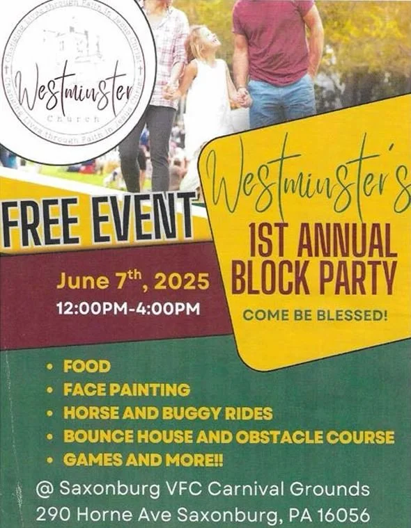 Block Party - Free Event - June 7th Westminster Church will be hosting a Block Party Jerry SeftonMay 5, 2025 Facebook0 Twitter LinkedIn0 Reddit Tumblr 0 Likes